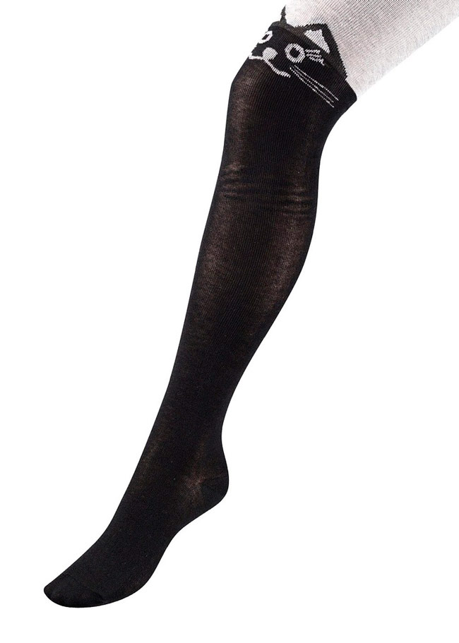Детские, двухцветные колготки из хлопка для девочек. Модель с принтом в виде кошки.