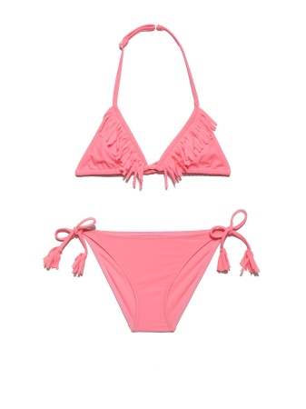 Костюм купальный для девочки из эластичного трикотажного полотна. Лиф мягкие треугольники без внутренней чашки фиксируется регулируемой бретелью за шею и тонкими завязками-спагетти на спине. Трусы купальные с завязками по бокам.