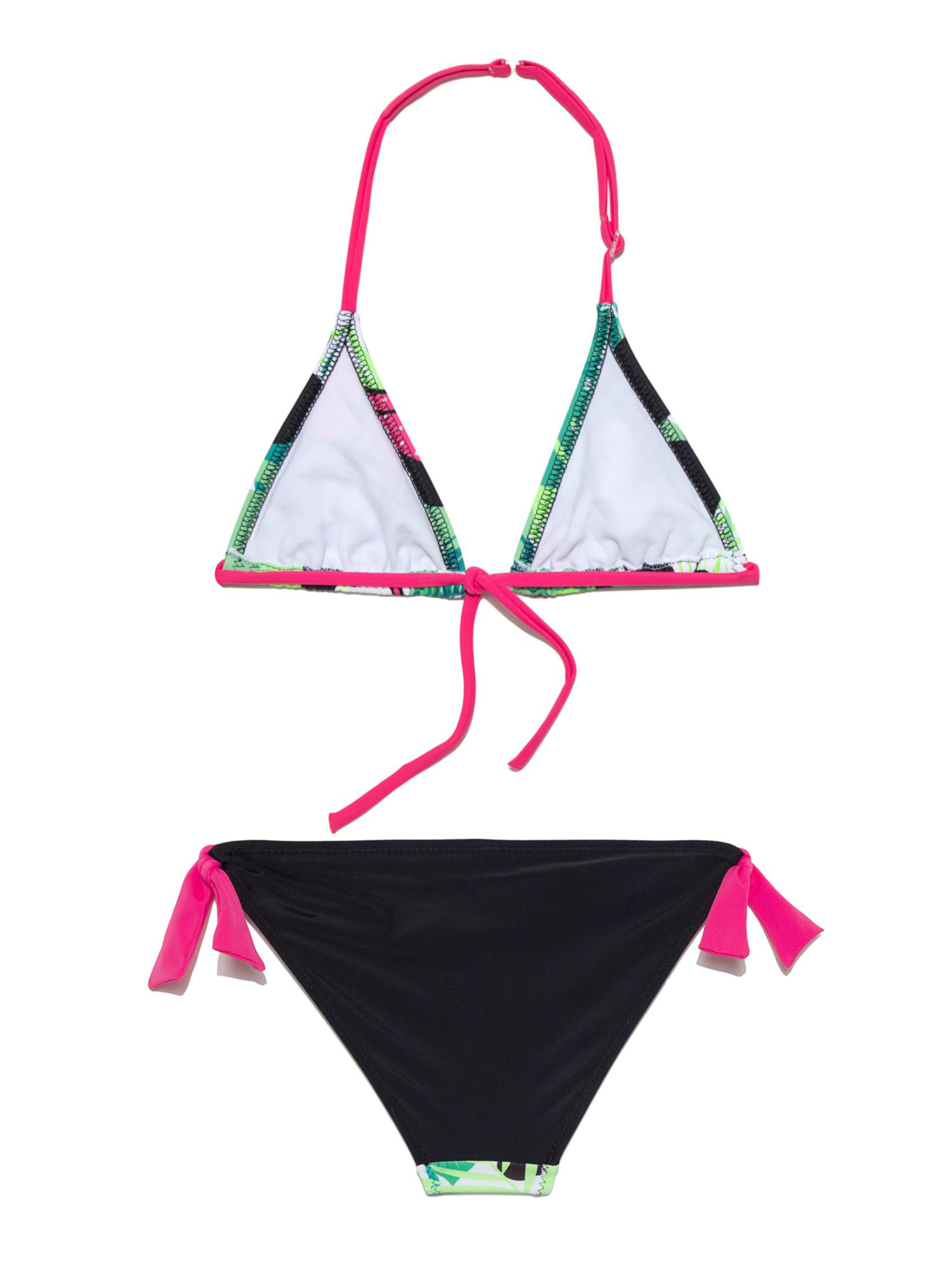 Костюм купальный для девочки из эластичного трикотажного полотна. Лиф мягкие подвижные треугольники без внутренней чашки, фиксируется регулируемой бретелью за шею и завязками-спагетти на спине. Трусы купальные классические с имитацией завязок по бокам.