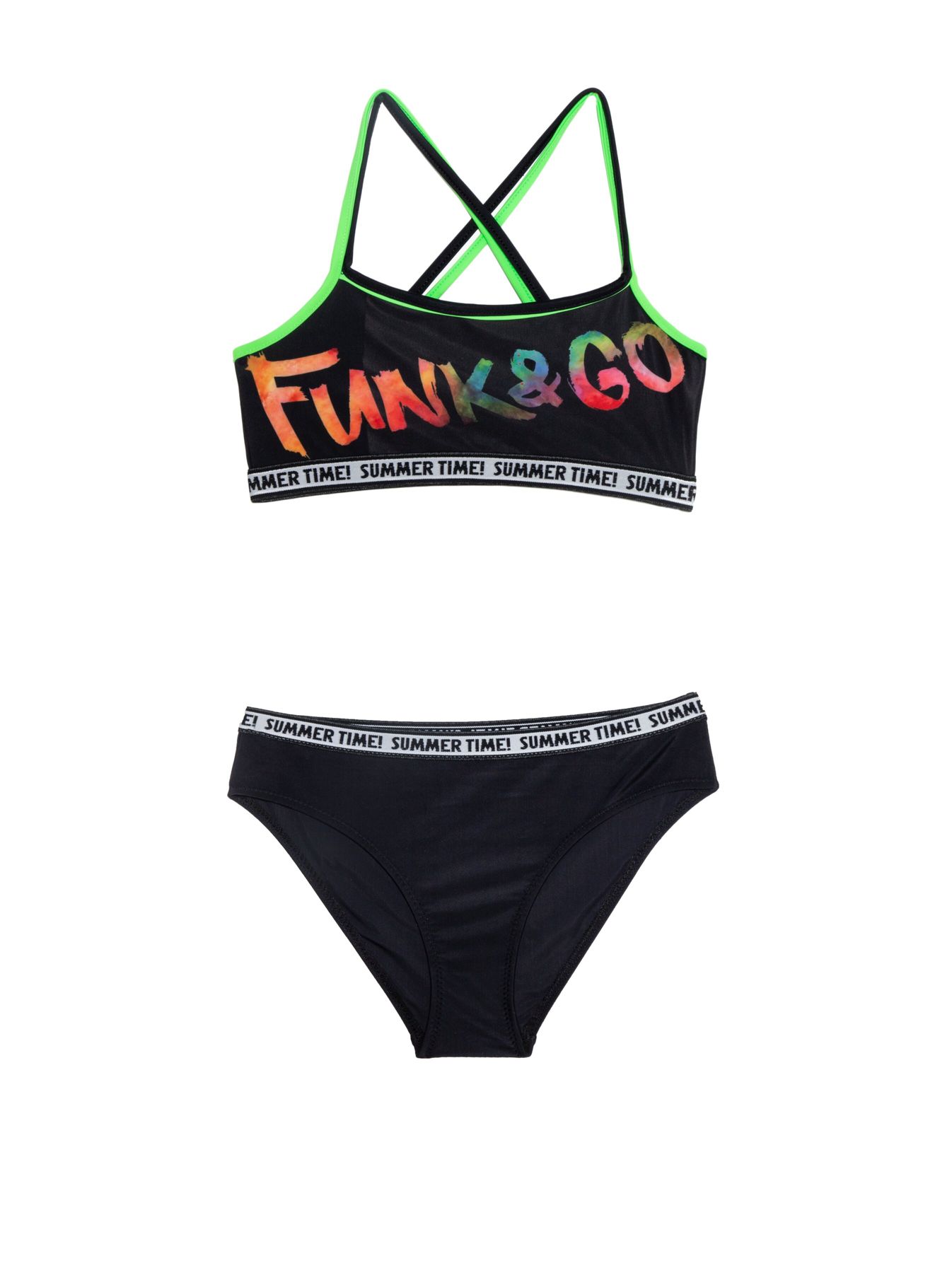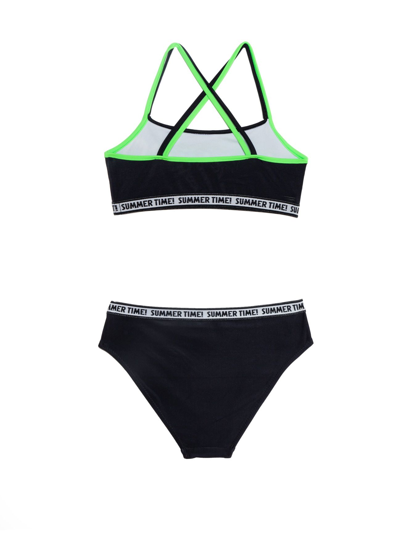 Купальный костюм для девочки из эластичного трикотажного полотна. Топ фиксируется тонкими бретелями по плечам. Трусы купальне классические. По низу топа и по талии в трусах пришита декоративная эластичная тесьма.