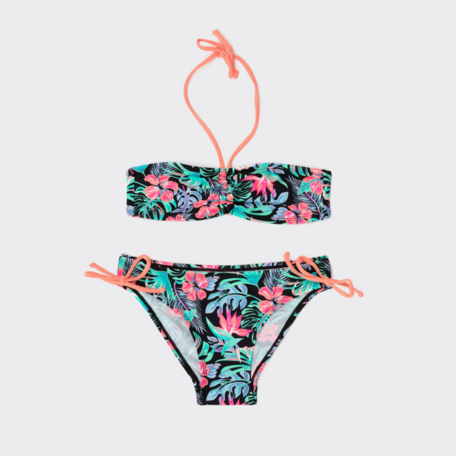 Детский купальник для девочек выполнен из набивного полотна с ярким цветочным акцентом. Купальник раздельный, топ фиксируется завязками на шее и кручками на спине. Классические трусы декорированы завязками по бокам.