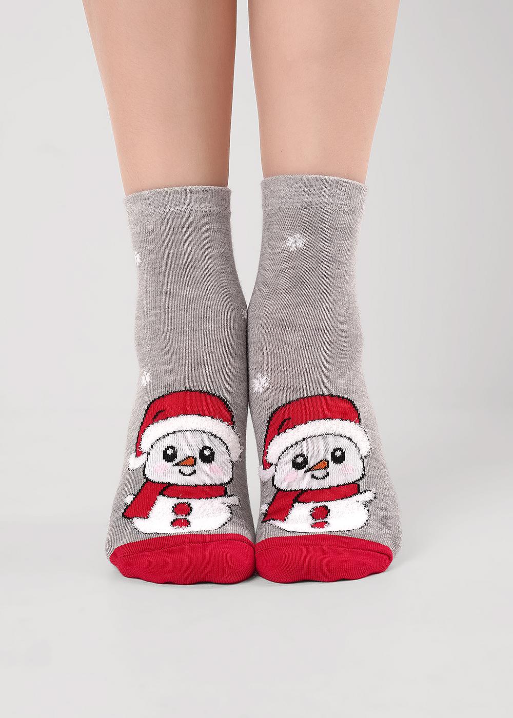 Детские носки с выделенным мысом и пяткой с рисунком снеговика, тело снеговика и отворот колпака выполнены из пряжи травка.