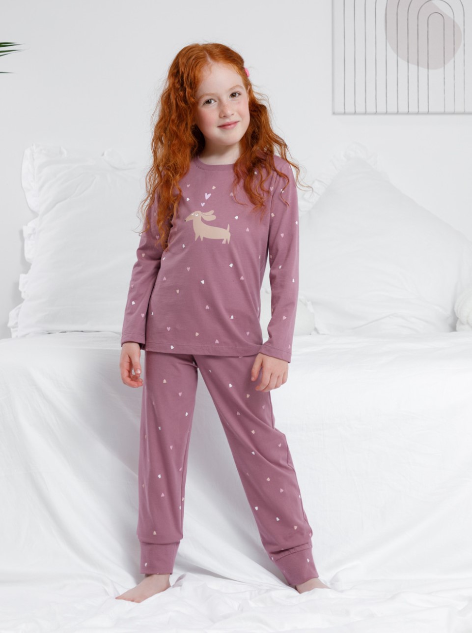 Пижама для девочки из натурального хлопка. Джемпер с длинными втачными рукавами и брюки с эластичной резинкой в поясе. Мягкие манжеты по низу брюк сделаны из материала в рубчик. Оригинальная набивка и принт выполнены из стойких текстильных гипоаллергенных красителей. Изделие сохраняет цвет и форму после многократных стирок.