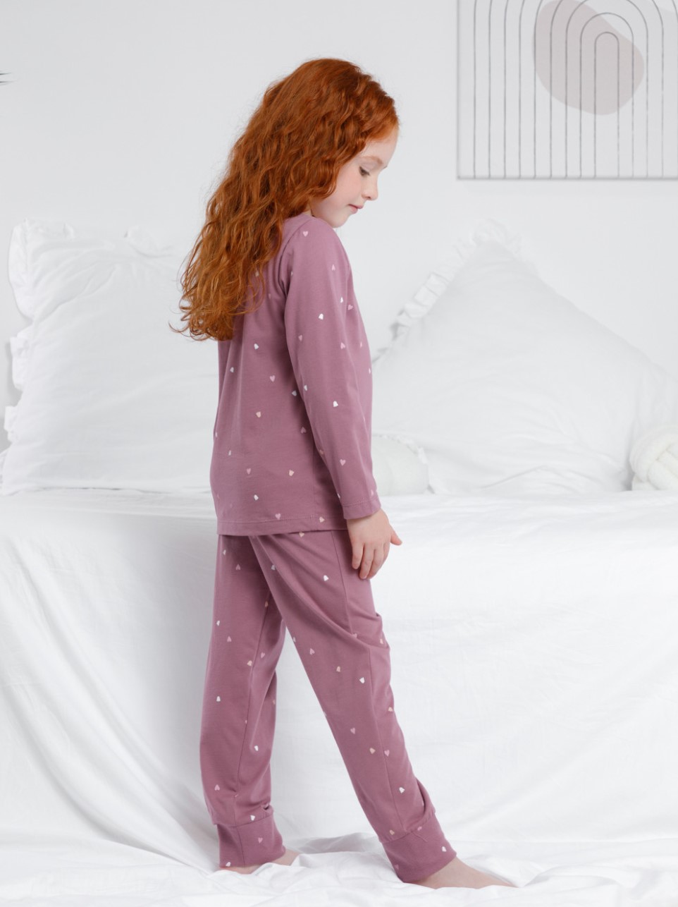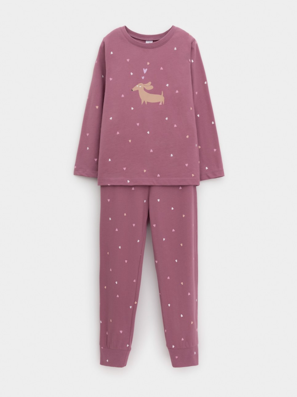 Пижама для девочки из натурального хлопка. Джемпер с длинными втачными рукавами и брюки с эластичной резинкой в поясе. Мягкие манжеты по низу брюк сделаны из материала в рубчик. Оригинальная набивка и принт выполнены из стойких текстильных гипоаллергенных красителей. Изделие сохраняет цвет и форму после многократных стирок.