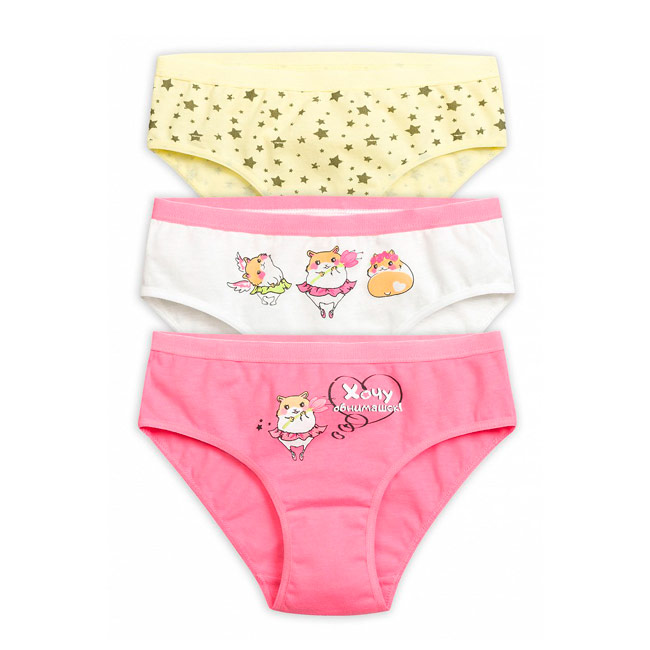 Детские трусы для девочек, модель слипы выполнены из однотонного или набивного хлопка. Трусы со средней посадкой по фигуре, оформлены окантовкой, принт - забавные хомячки и алловер-принт звёзды. Ластовица из хлопка. Цена указана за одну позицию.