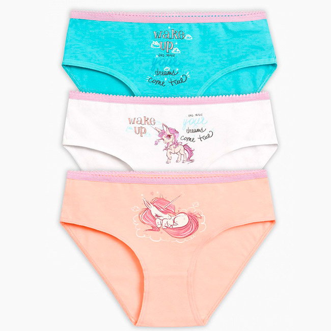 Трусики-шортики для девочек выполнены из однотонного трикотажного хлопка с добавлением небольшого количества эластана. Цвета: персиковый, бирюза, белый. Принт: волшебные пони. По талии - контрастный эластик. Цена указана за одну позицию. При заказе через интернет-магазин указывайте в комментариях цвет изделия.
