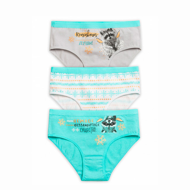 Трусы-слипы для девочек с высокой линией талии, из трикотажного хлопка, с тематическим принтом: енот и надписями. Цвета: серый/белый/ментол. По талии мягкая и эластичная резинка. Цена указана за одну позицию. При заказе через интернет-магазин указывайте цвет изделия.
