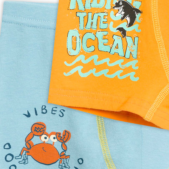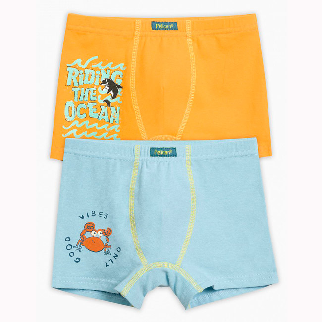Детские трусы-боксеры для мальчиков выполнены из натурального однотонного хлопка голубого или оранжевого цвета. Трусы комфортной посадки, декорированы тематическим принтом. На поясе комфортная резинка и фирменный логотип. При заказе через интернет-магазин указывайте цвет изделия.