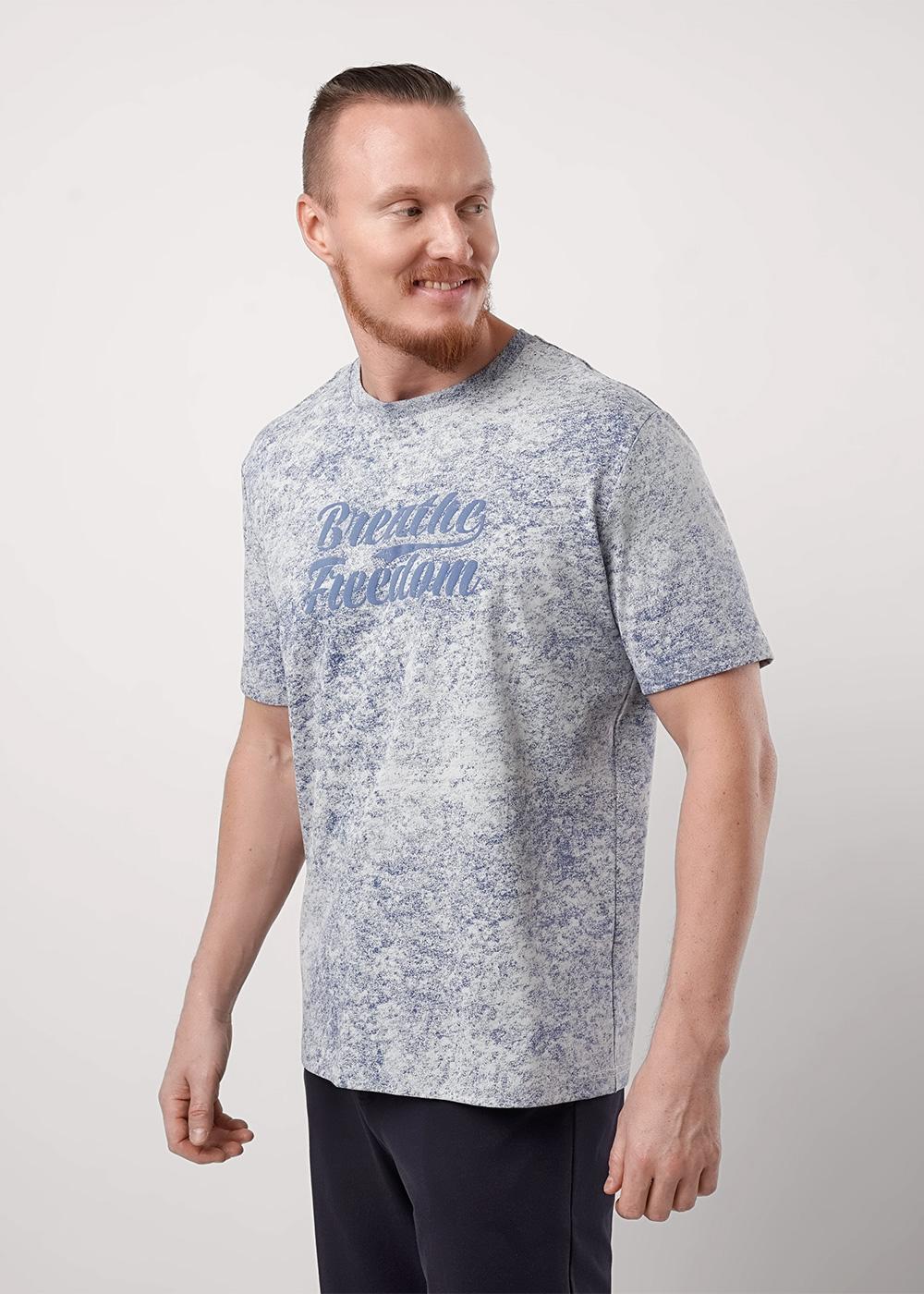 Футболка мужская в набивку из дышащего хлопкового полотна с округлой горловиной и коротким рукавом. Модель дополнена дизайнерским принтом. Прекрасное решение для создания уютного домашнего образа.
