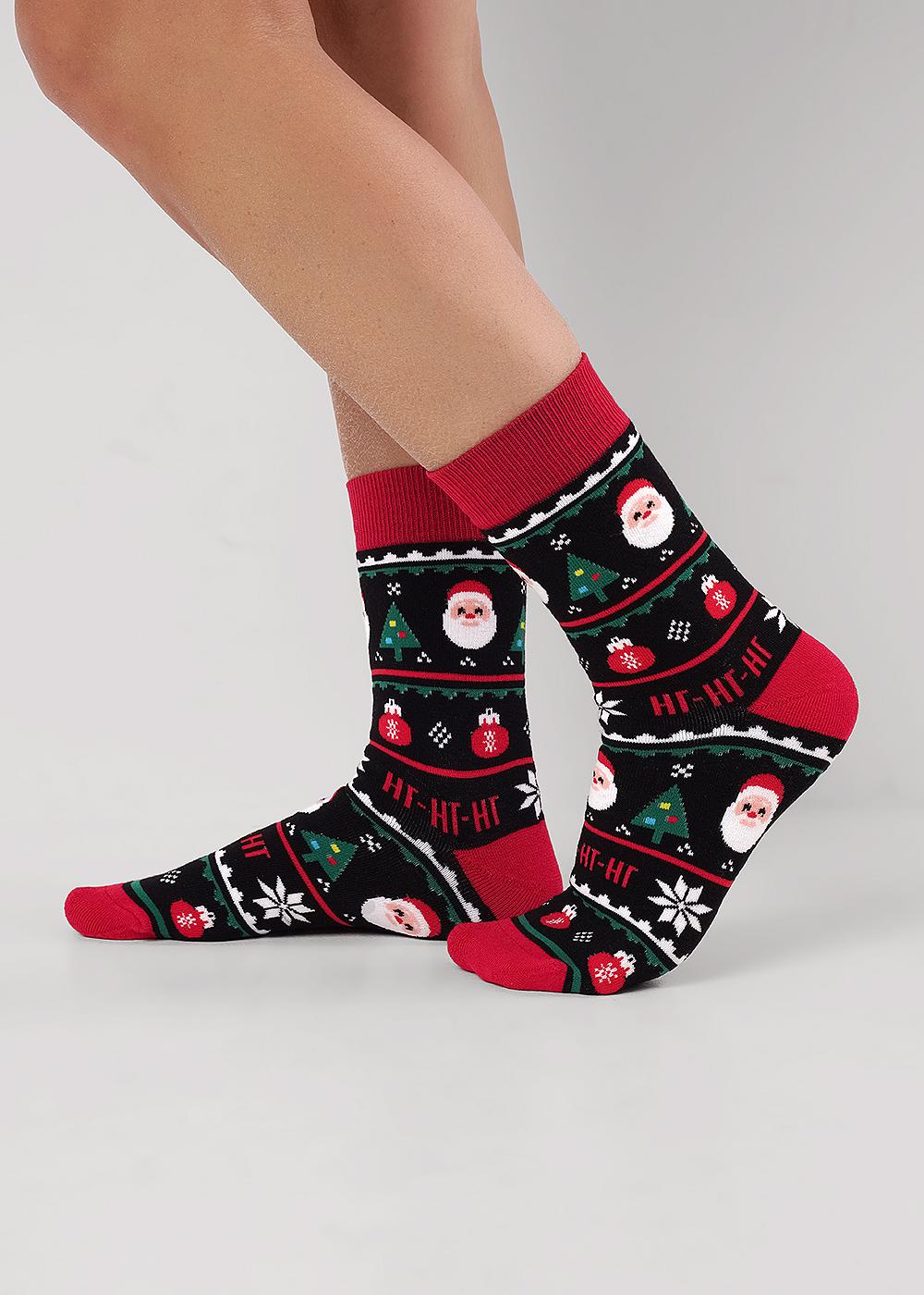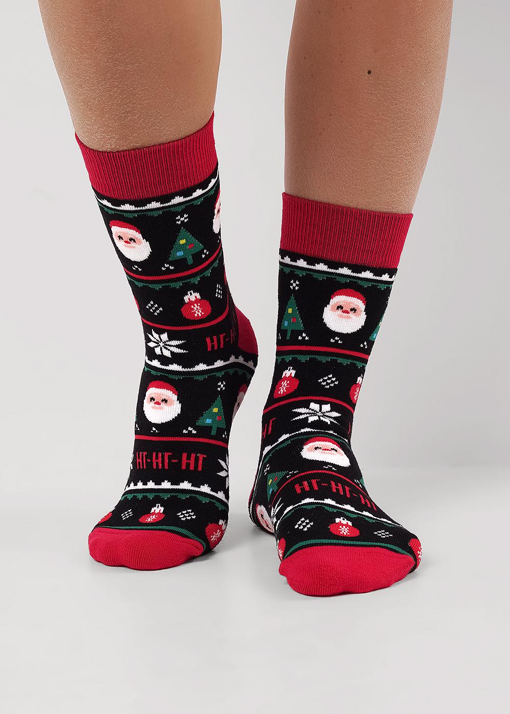 Теплые плюшевые новогодние носки со скандинавским орнаментом и рисунком дед мороза.