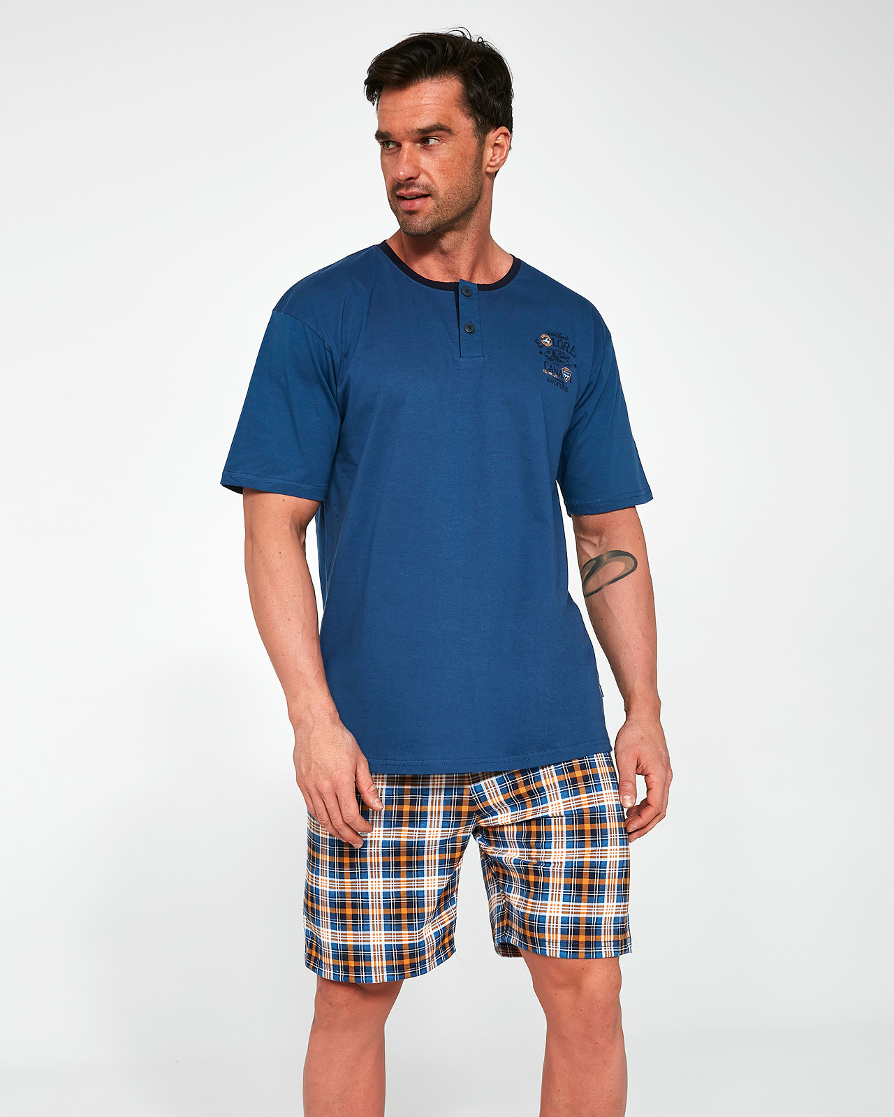 Пижама мужская из качественного хлопка. Футболка синего цвета с круглым воротом на пуговицах, шорты в цветную клетку.