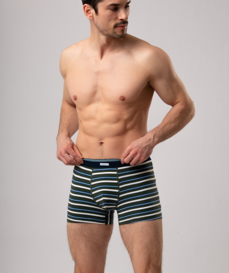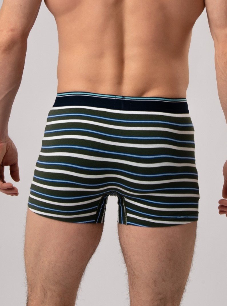 Мужские трусы боксеры от торговой марки Индефини. Трусы-боксеры из хлопка, цвета хаки, с принтом в полоску, на мягкой резинке.