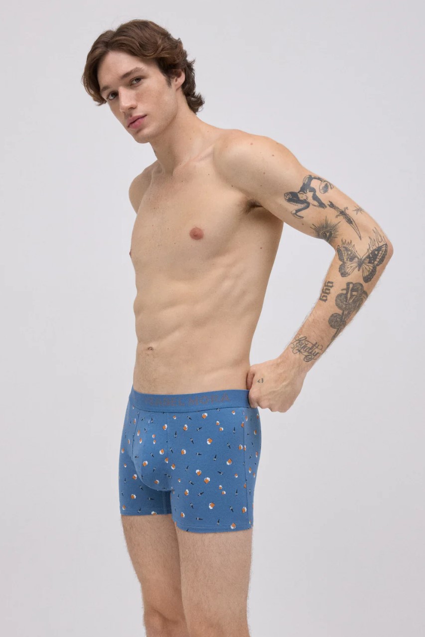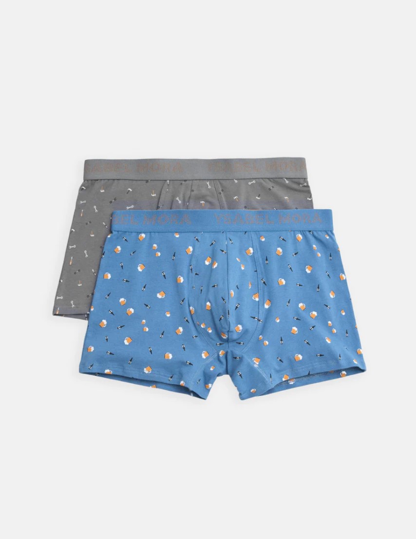 2 пары боксёров с принтом от Ysabel Mora, изготовленные из натурального хлопка с добавлением эластана для дополнительного комфорта. На одном боксерах принт с изображением инструментов, на другом — с изображением напитков. Эластичный пояс с логотипом бренда придаёт изделию современный и оригинальный вид.