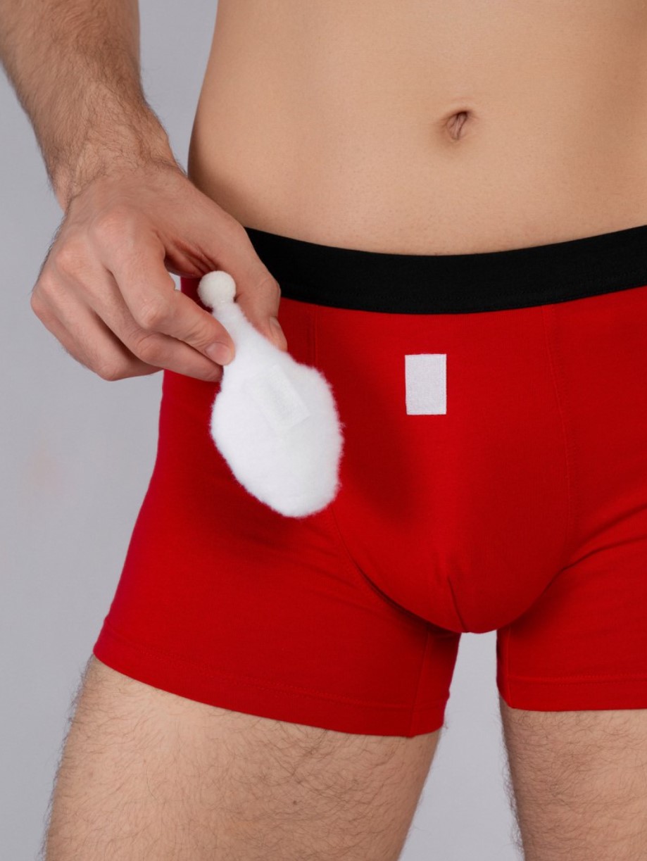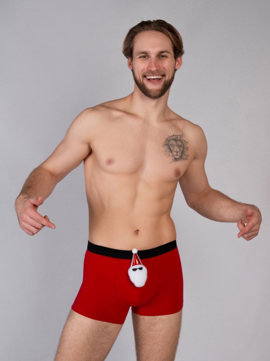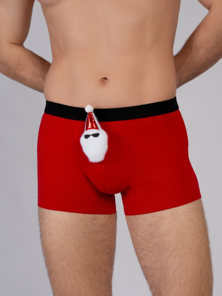 Мужские трусы-боксеры крепко держатся на талии за счет эластичной резинки. Хлопковый материал делает трусы дышащими и приятными на ощупь, что гарантирует приятные ощущения во время носки. Трусы-боксеры украшены липучкой спереди в форме головы Деда Мороза.