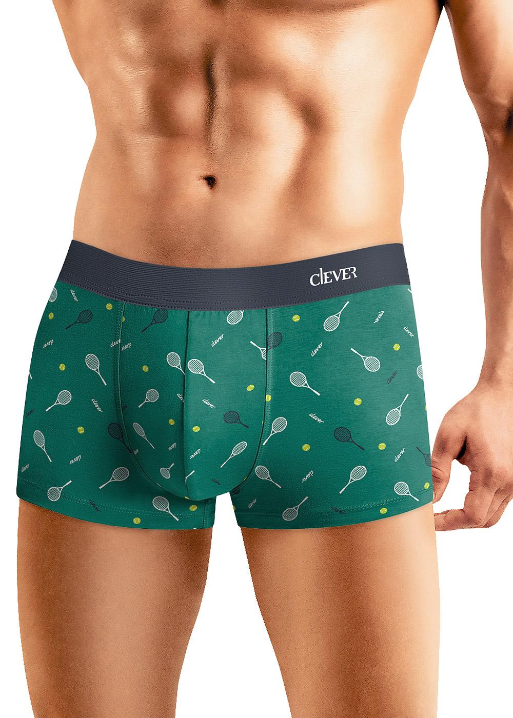 Шорты средней длины комфортной посадки выполнены из оригинального полотна в мелкую графику "ракетки". Трусы дополнены жаккардовой резинкой и стильным прорезиненным принтом.