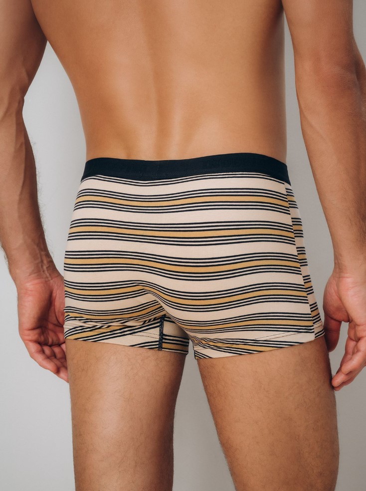 Мужские трусы боксеры изготовлены из хлопка и выполнены в бежевом цвете с принтом в полоску. Трусы средней посадки имеют на талии мягкую эластичную резинку.