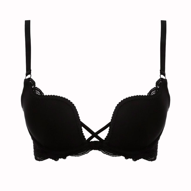 Бюстгальтер женский выполнены из эластичной гладкой микрофибры, с кружевным поясом, цвет черный. Бретели несъемные, регулируются по длине, спинка на крючках-застежках. Чашки с эффектом Push-Up (съемные вкладыши), декорированы сексуальными перемычками.