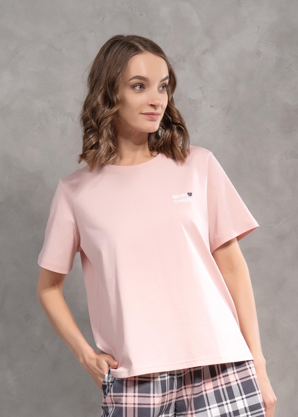 Женская домашняя футболка прямого слуэта из плотного хлопка, рукав слегка спущенный, рядом с горловиной нанесен принт.