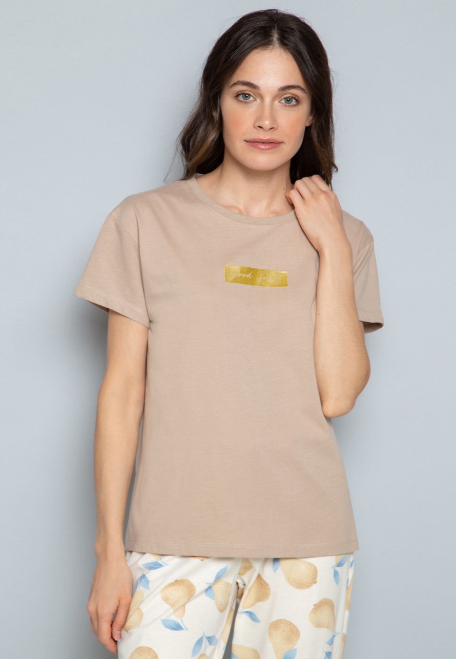 Лёгкая футболка с короткими рукавами. Сшита из однотонного трикотажа супрем с эффектом слаб. Спущенные плечи создают свободный силуэт. Украшена принтом на полочке. Низ обработан плоскими швами.
