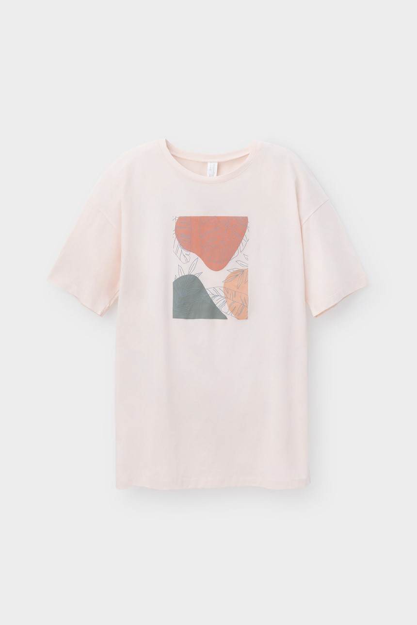 Удлиненная футболка из лёгкого трикотажа супрем. Свободные рукава со спущенной линией плеча создают объём и свободный силуэт. Принт изготовлен из стойких текстильных красителей.