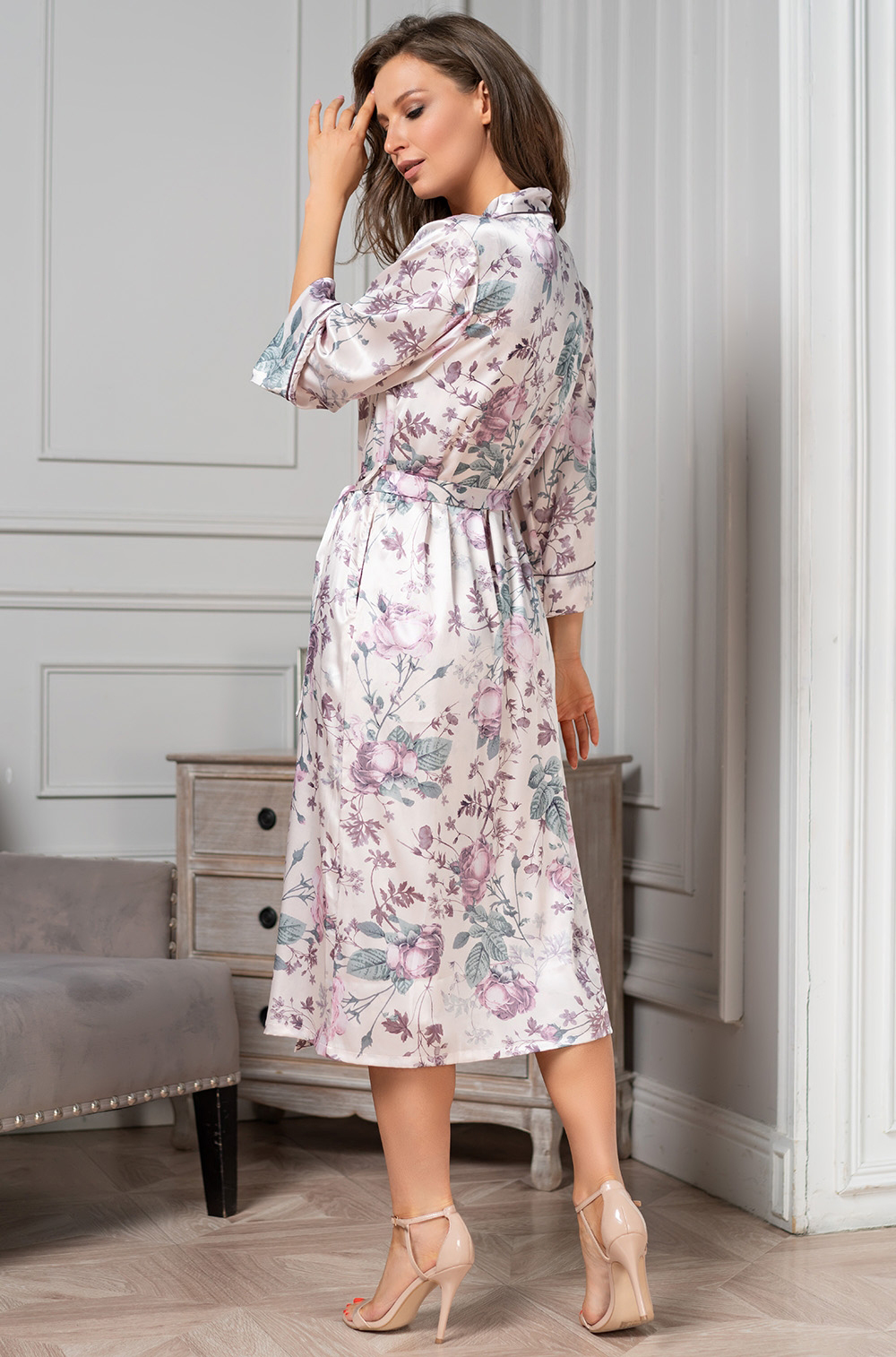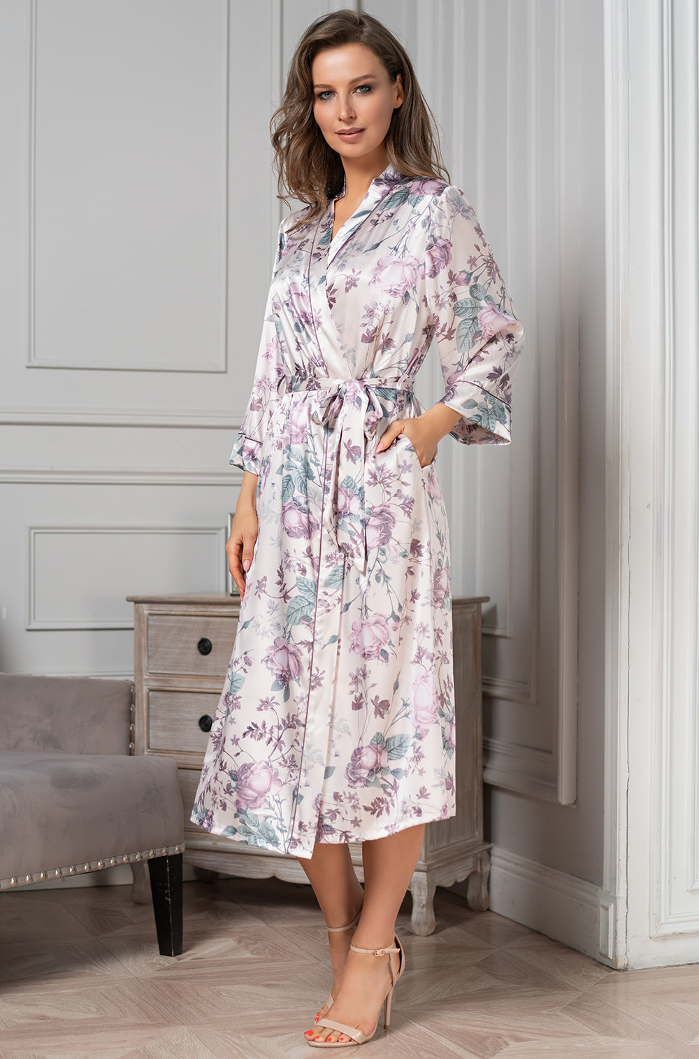 Длинный классический запашной халат Mia-Amore с длинным рукавом, выполнен из принтованного смесового шелка. Тонкий контрастный кант проходит по линии борта и низу рукавов. По бокам обработаны карманы.