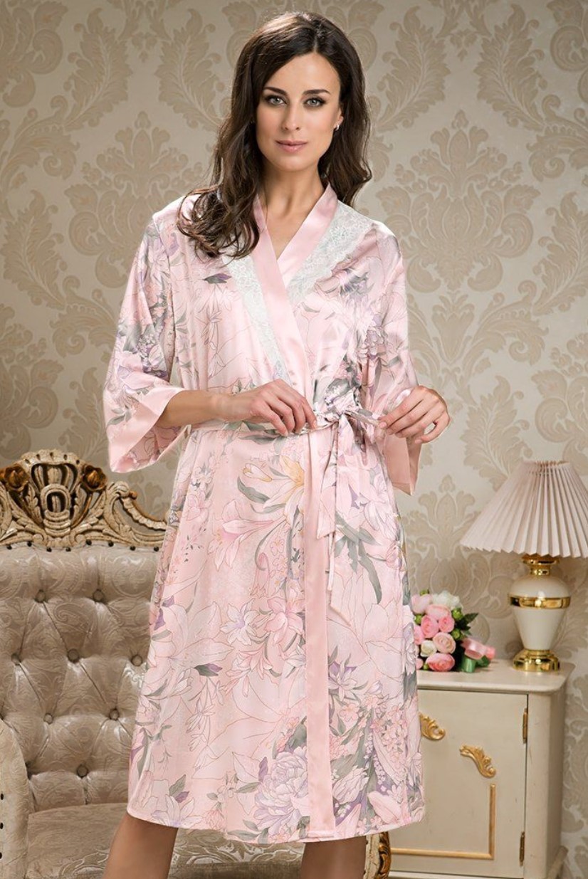 Классический длинный халат–кимоно Mia-Amore выполнен из смесовой ткани с эффектом объемного 3D-рисунка. В качестве отделки используется ажурное кружево и однотонный атлас.