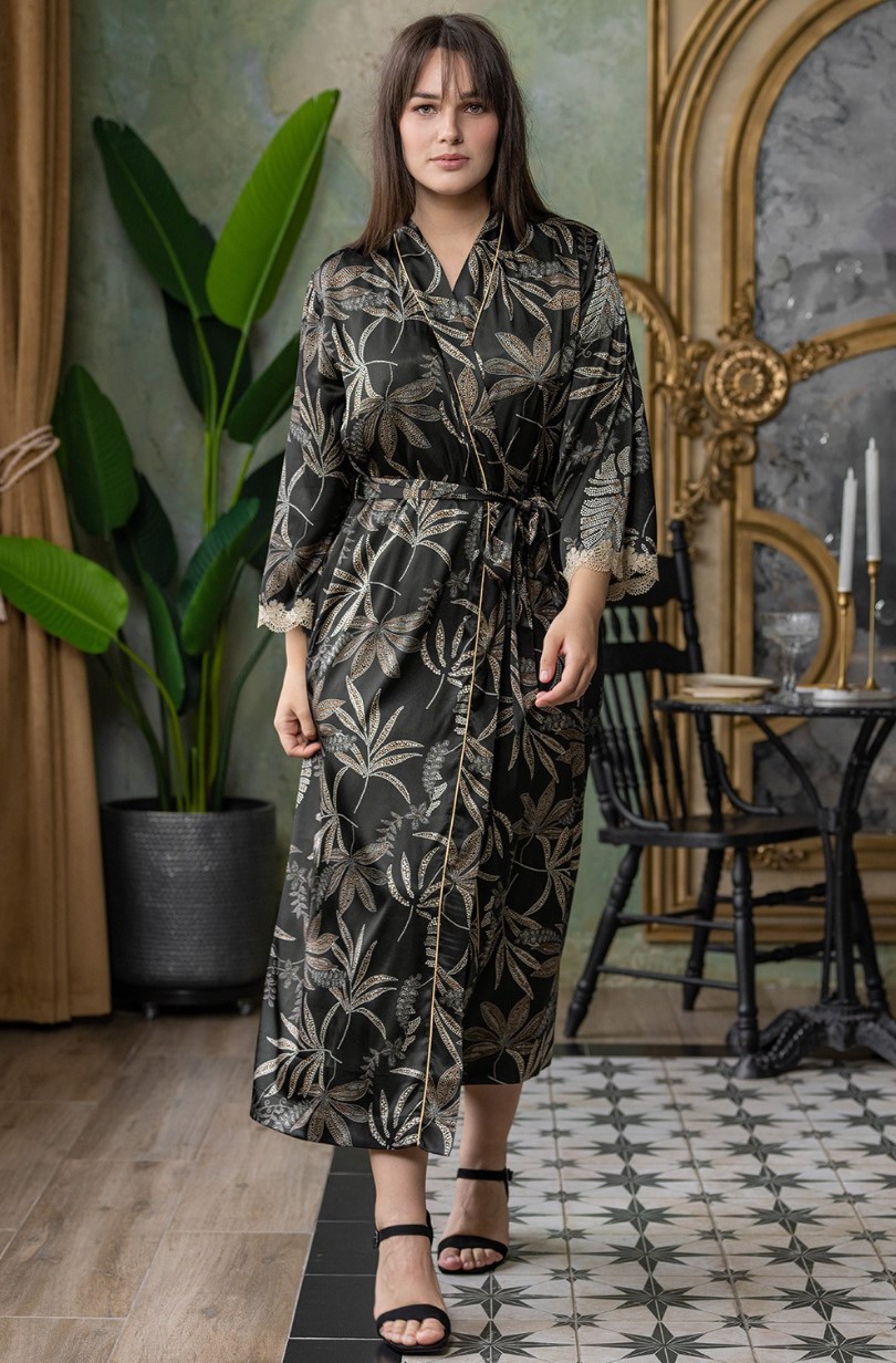 Длинный халат Mia-Amore выполнен из принтованного смесового шелка. Ажурное кружево расположено по низу рукавов, борт халат отделан атласным узким кантиком.