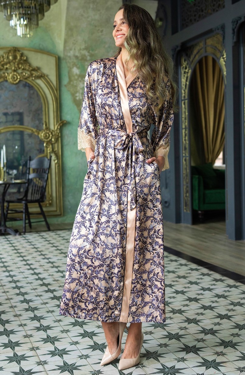Длинный запашной халат Mia-Amore с широким рукавом длиной 3/4. Халат выполнен из искусственного принтованного шелка с однотонной и кружевной отделкой. Линию борта подчеркивает контрастный кант. В боковых швах халата обработаны карманы.