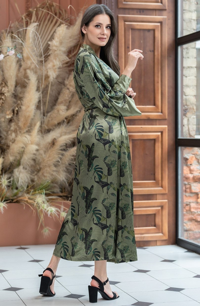 Длинный халат-кимоно Mia-Amore с широким рукавом длиной 3/4 . Халат выполнен из принтованного смесового шелка с однотонной отделкой. По бокам модели обработаны карманы.