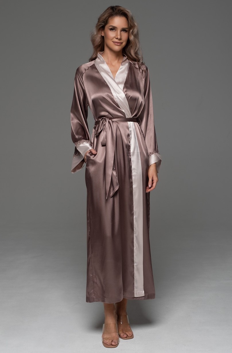 Длинный запашной халат Mia-Amore с длинными рукавами выполнен из однотонного смесового шёлка. Рукава декорированы по низу широким манжетом из перламутрового шёлка и ажурным кружевом. Планка халата также контрастного перламутрового цвета. Халат комплектуется широким поясом, в боковых швах карманами.