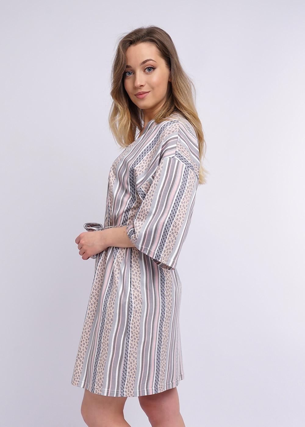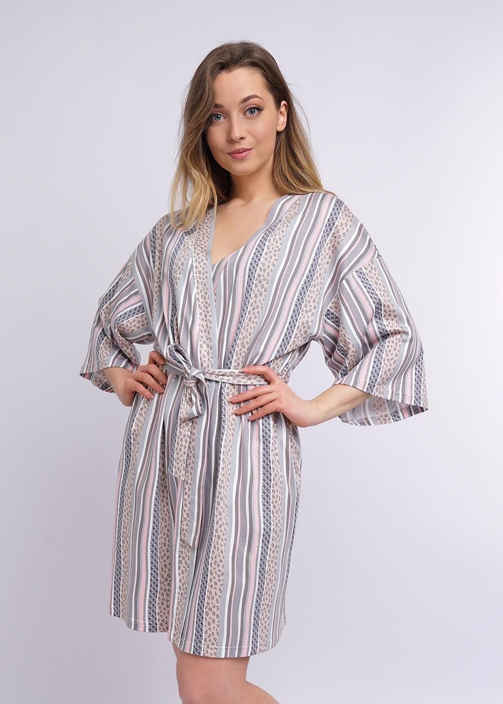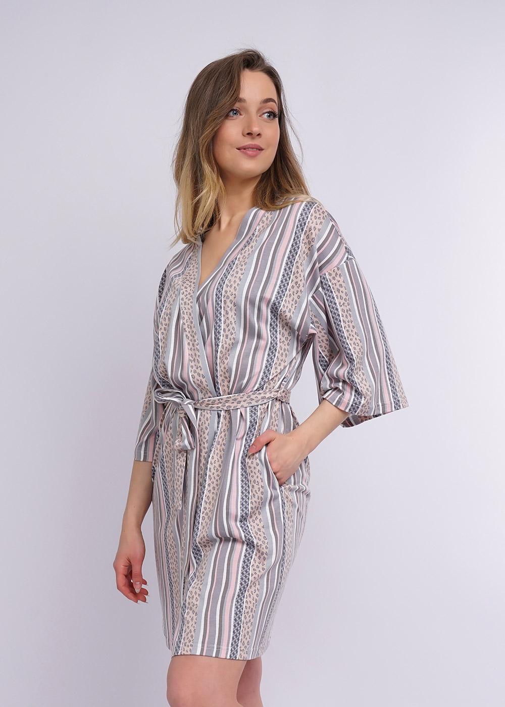 Халат-кимано из трикотажного полотна. Спущенная линия плеча, короткий рукав. По талии съёмный пояс, вставлен в шлёвки по бокам.