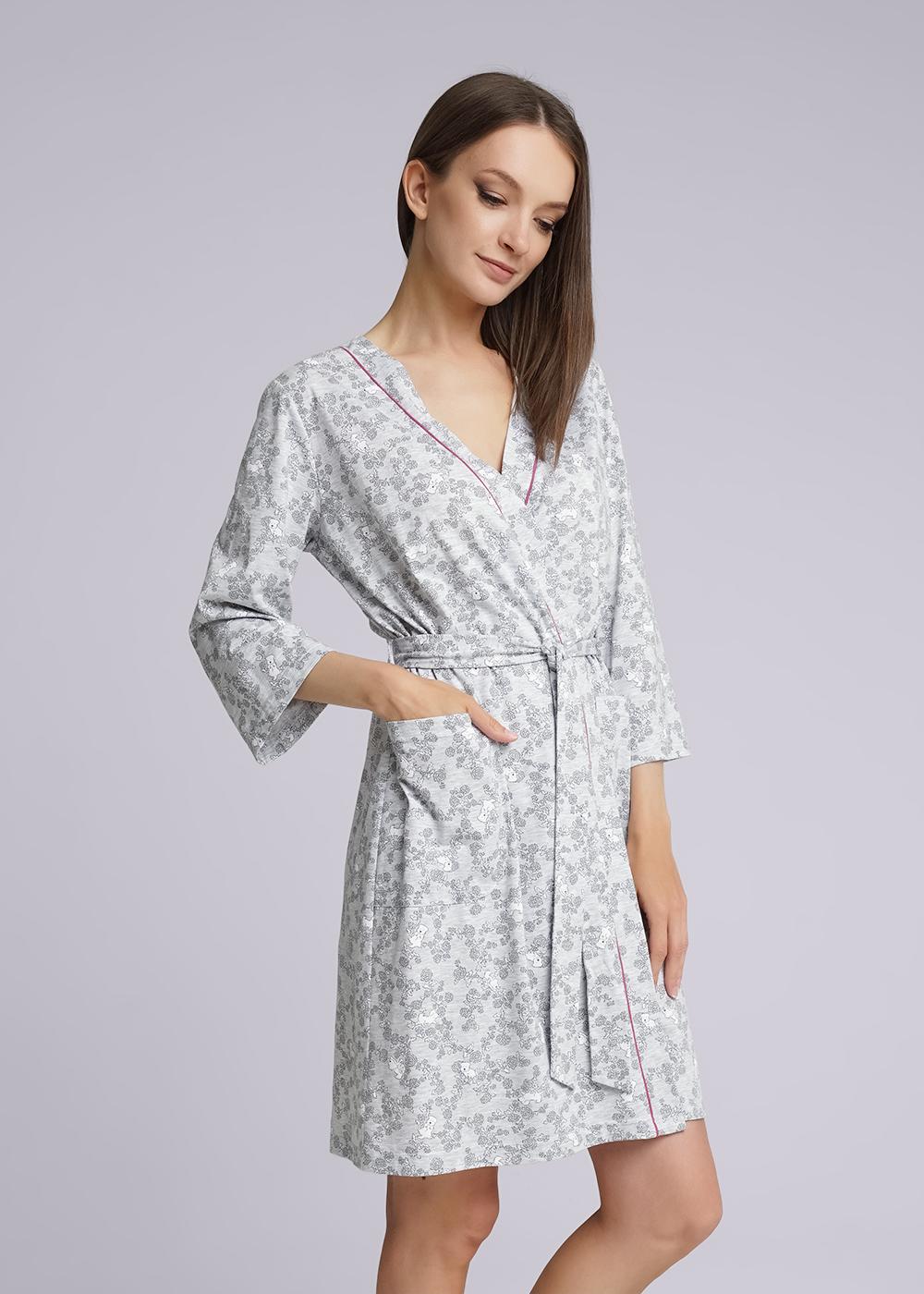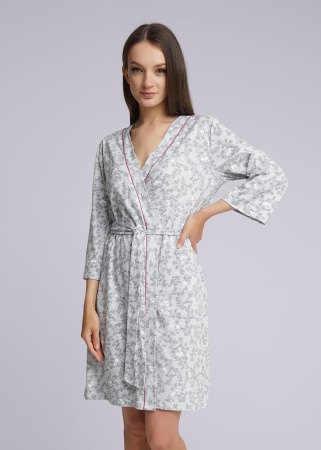 Халат на запах с поясом для дома из трикотажного меланжевого полотна с хлопком в составе. Рукав длиной 3/4. По борту контрастный кант. По переду накладные карманы.