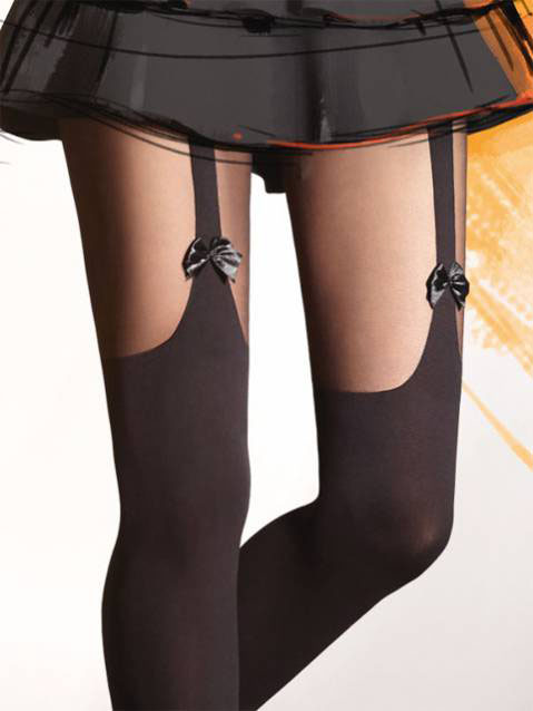 Матовые фантазийные колготки с комфортным широким поясом, плоскими швами и ластовицей, украшенные имитацией непрозрачных чулок с подвязками и бантиками.