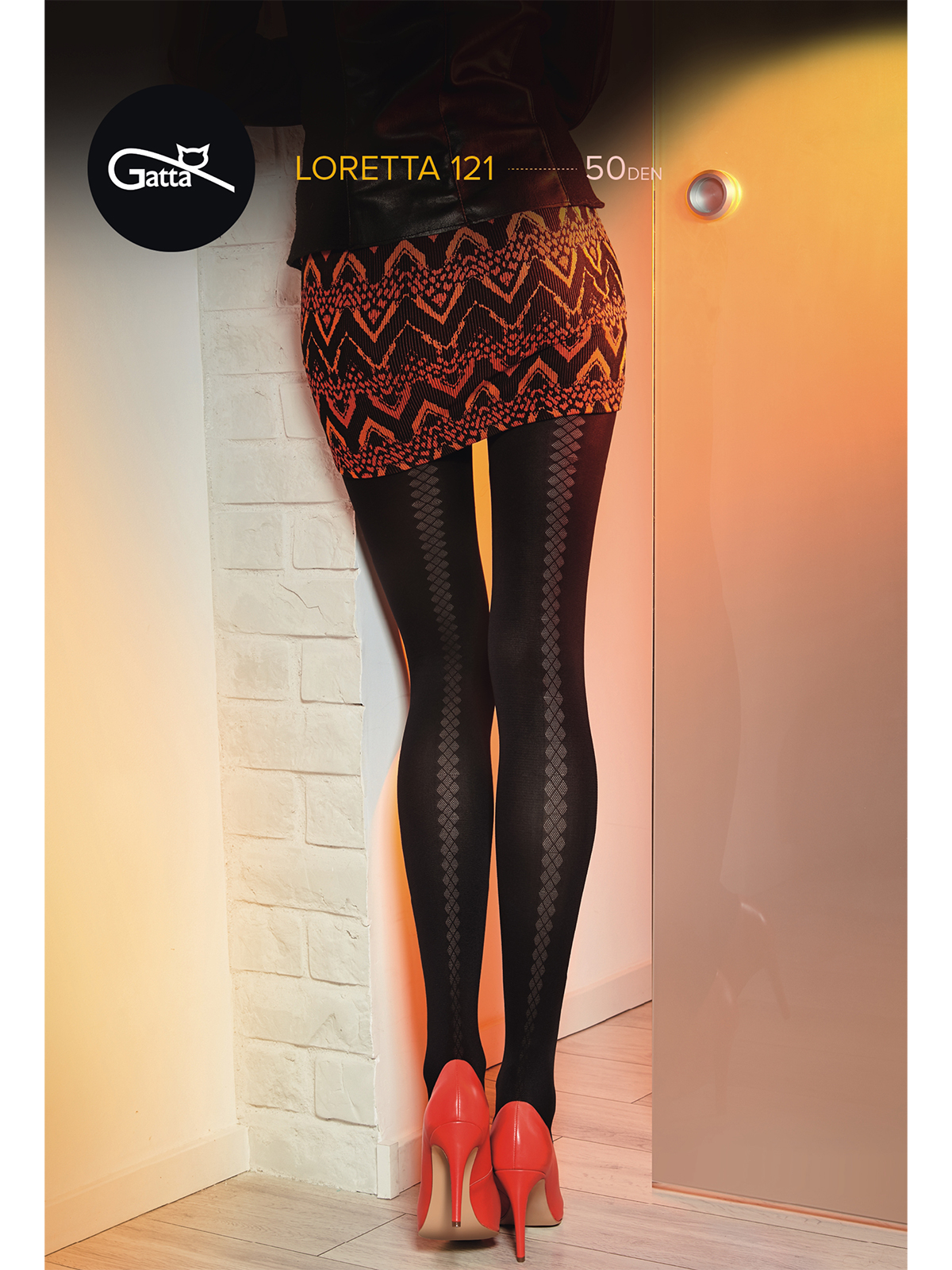 Непрозрачные фантазийные колготки из микрофибры с лайкрой, плотностью 50 ден, с широким комфортным поясом, ластовицей и плоским швом. Вдоль задней части ноги модели размещен просветный узор "цепочка из ромбов".