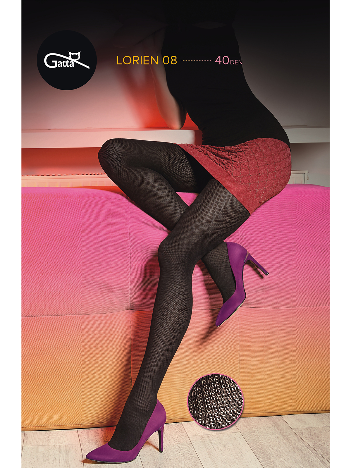 Полупрозрачные фантазийные колготки из микрофибры с лайкрой, плотностью 40 den, с ластовицей, широким поясом и усиленным плоским швом. Вся нога модели украшена просветным сетчатым узором.
