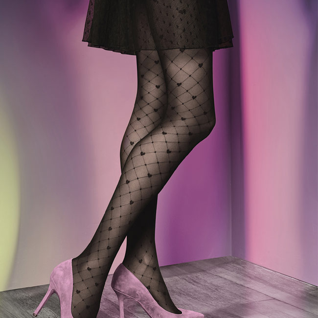 Прозрачные фантазийные колготки с лайкрой, плотностью 40 den, с широким комфортным поясом, ластовицей и усиленными плоскими швами. По всей ноге модели размещен тканый узор "сетка с сердечками".