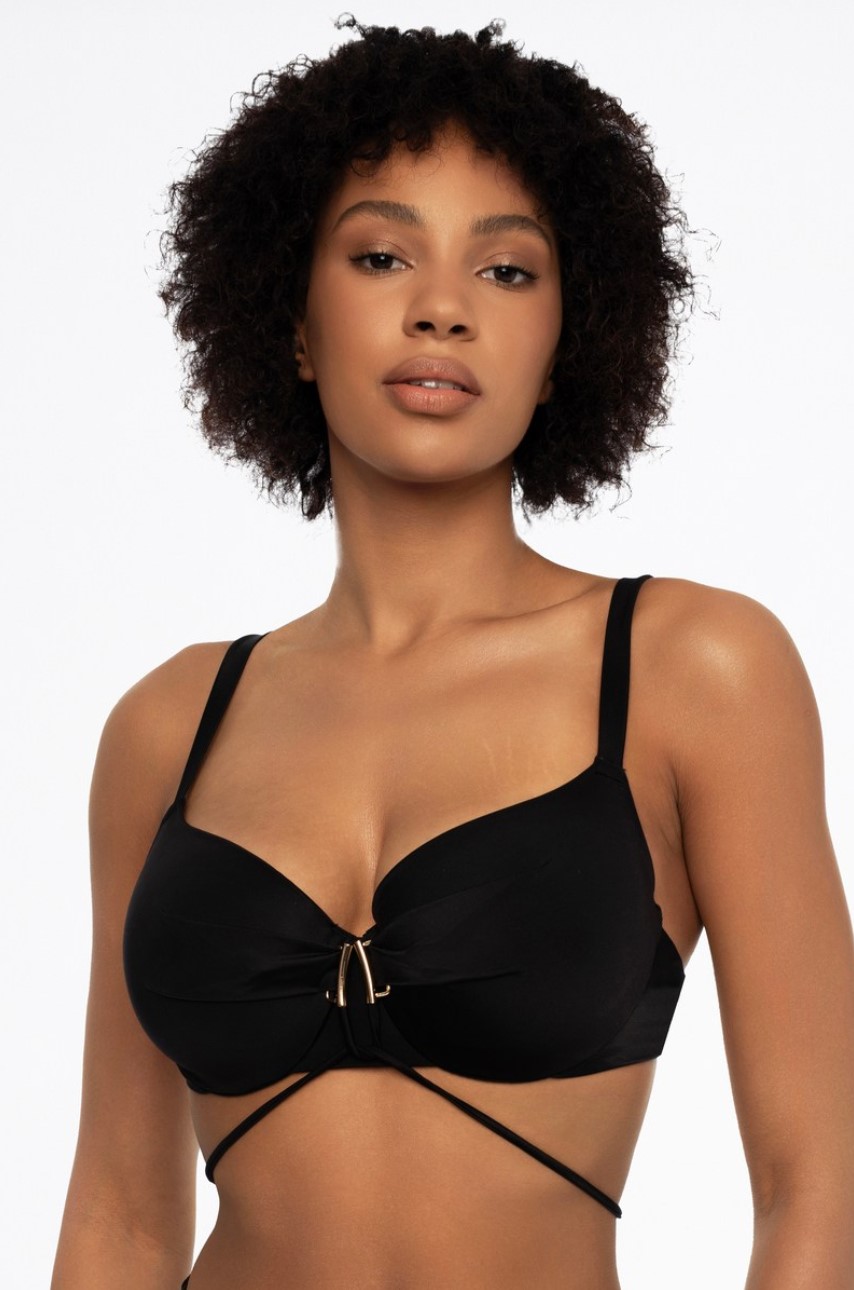 Бюст купальный 41552 THEA с чашкой из тонкого поролона на кости, на базе Beautiful. Бретели несъемные, регулируемые по длине. Декоративный шнурок завязывается через шею или на спине. Застежка на спине, спинка с регулировкой объема. Высокие купальные трусы 41554 THEA. Плавки на подкладе из микрофибры.Состав подклада: 100% полиэстер