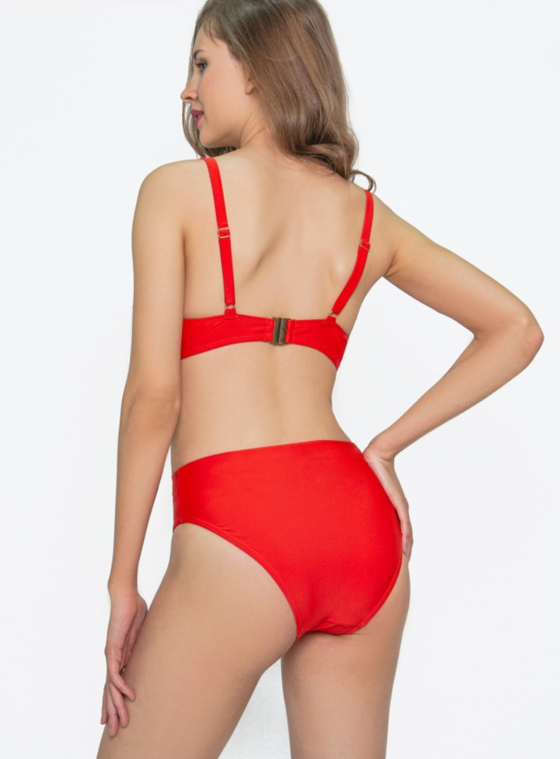 Раздельный купальник от торговой марки Индефини. В комплекте бюстгальтер и плавки. Бюстгальтер из полиамида, красного цвета, без косточек и без Push-up, со съемными подкладками, с небольшим вырезом, с декоративной вставкой, на тонких регулируемых лямках, с металлической застежкой. Плавки из полиамида, красного цвета, с декоративной вставкой, на мягкой резинке.
