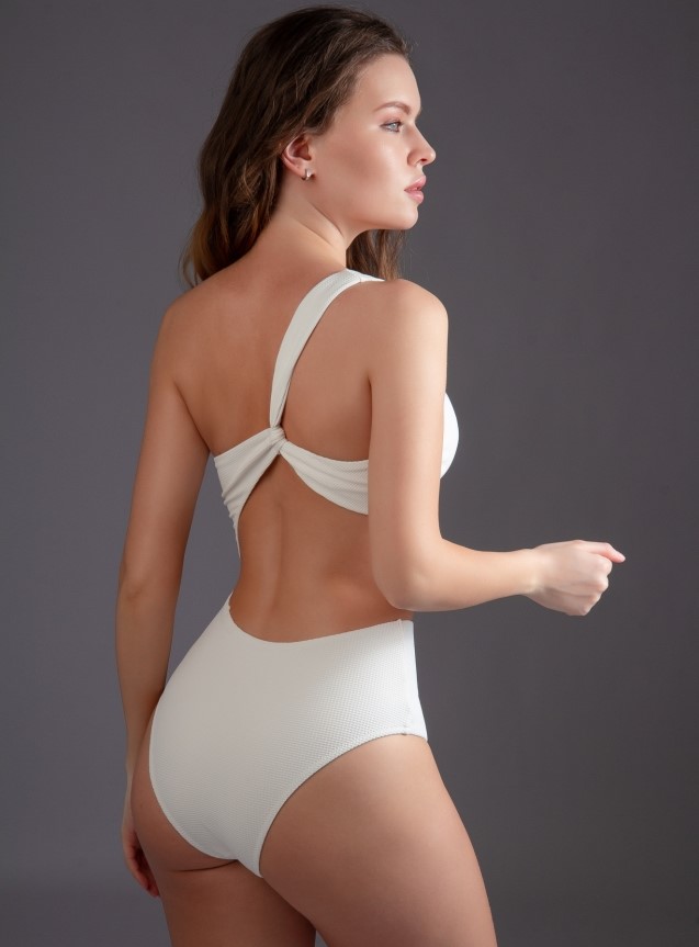 Слитный купальник от торговой марки Индефини. Купальник из полиамида, белого цвета, со съемными подкладками, в рубчик, на одной лямке, не регулируется.