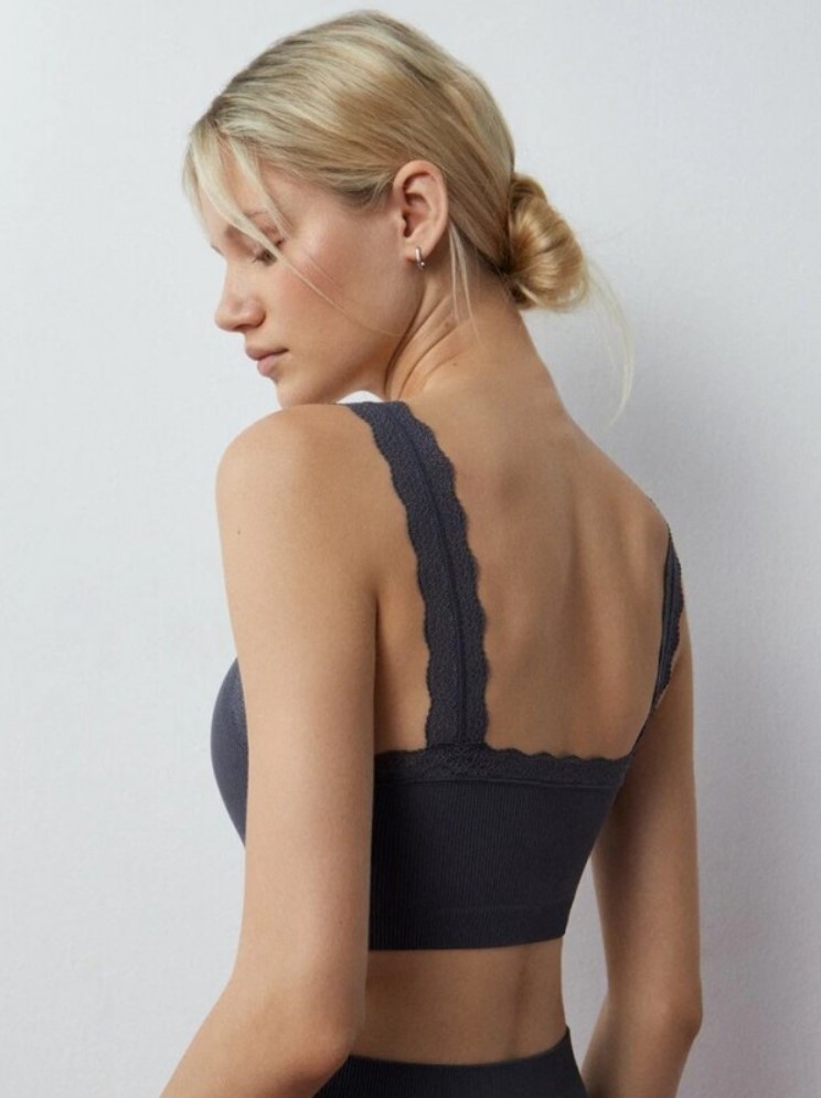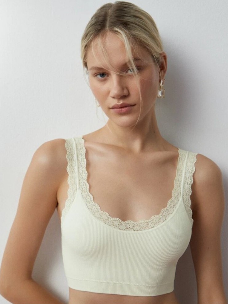 Комфортный топ в рубчик на широких кружевных бретелях со съемными формованными вкладышами. Верх лифа обработан ажурным кружевом с изящным цветочным рисунком.Изготовлен по бесшовной технологии Seamless из мягкой микрофибры, которая отлично пропускает воздух и обладает нежной текстурой. Топ превосходно облегает и приятно ощущается на теле благодаря отсутствию боковых швов. Хорошо сохраняет форму и цвет. Удобная вывязанная резинка обеспечивает надежную поддержку.Элегантный топ можно носить в качестве повседневного нижнего белья