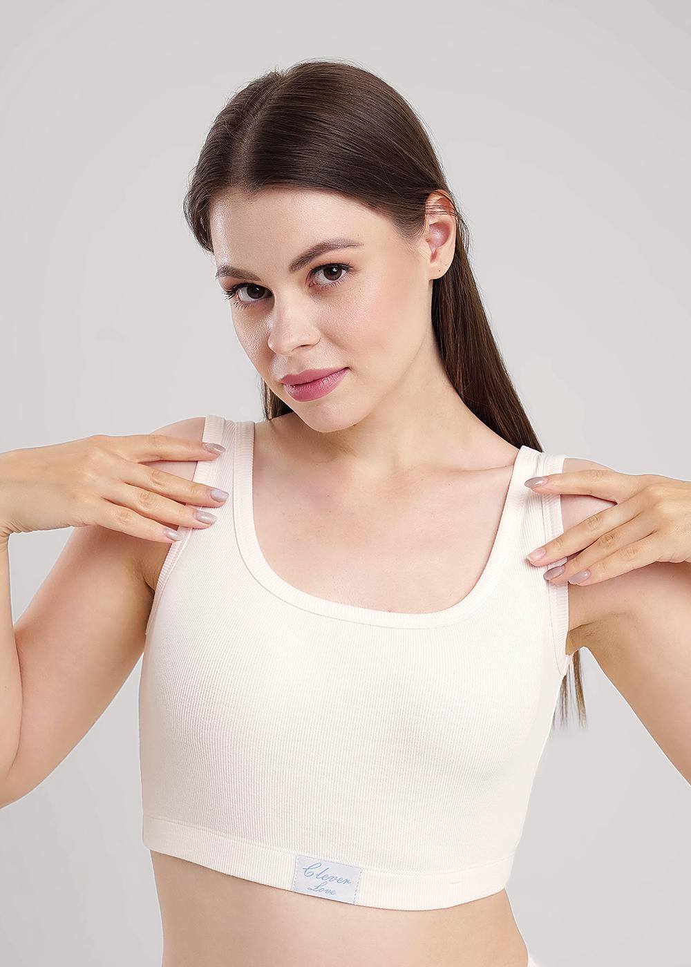 Майка топ укороченная из трикотажного полотна кашкорсе лапша с эластаном. Средняя ширина бретели. Округлый вырез горловины. По горловине, пройме окантовка. По низу изделия внутренняя резинка, по центру жаккардовая нашивка.
