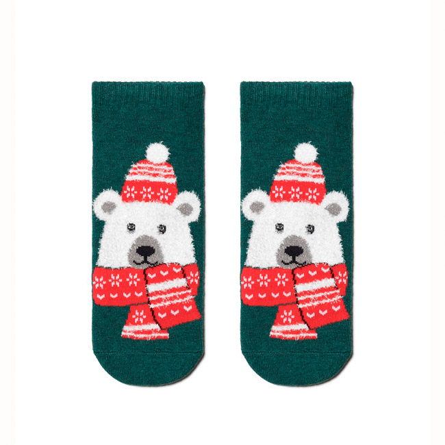 Короткие хлопковые носки с новогодними рисунками выполнены из мягкого хлопка бирюзового цвета с добавлением эластана. Носки плотно облегают ногу и не сползают, подходят для занятий спортом. Благодаря инновационным нитям лайкра носки восстанавливают свою первоначальную форму раз за разом и медленно изнашиваются.