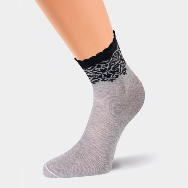 Женские трикотажные носки из хлопка с добавлением эластичных нитей. Носки однотонные, серого цвета, На удлиненной голени тематический рисунок и эластичная резинка черного цвета.