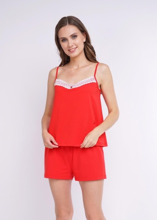 Комплект из майки и шорт из трикотажного полотна. Майка на регулируемых брителях, к низу чуть расширена. По переду кружево. Спереди металлический декор. Шорты с поясом на резинке, по бокам вставка из кружева.
