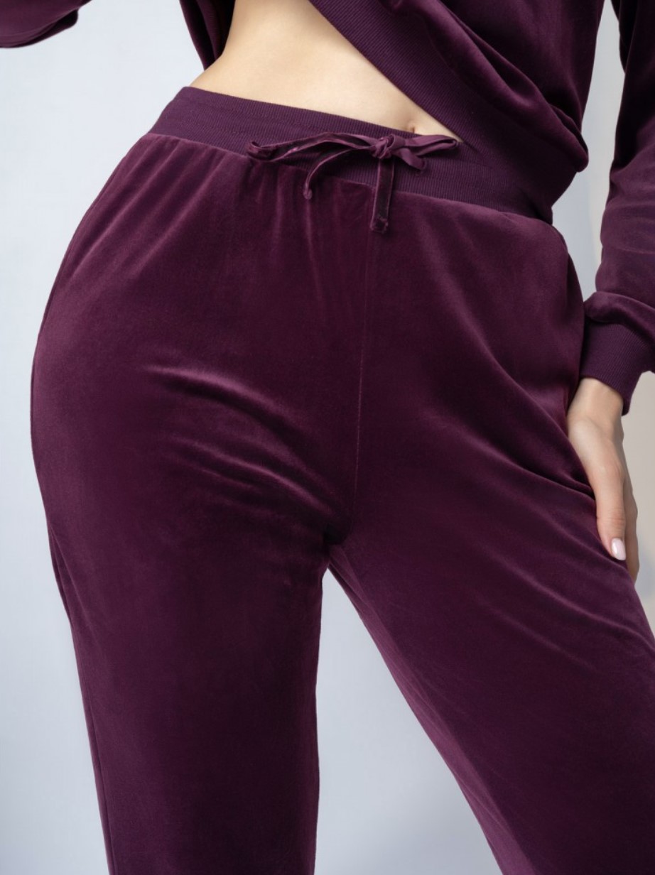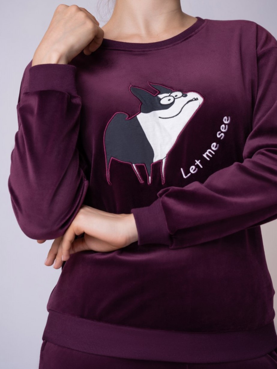 Женская пижама пурпурного цвета выполнена из мягкого и приятного на ощупь полиэстера, отличающийся высокой износостойкостью и легкостью. Он быстро сохнет, не мнется, легко стирается, цветоустойчивый, благодаря чему яркий пурпурный цвет пижамы останется насыщенным после множества стирок. В комплект входят кофта с длинными рукавами и брюки. Кофта украшена принтом-вышивкой с изображением игривого пёсика, добавляющий шарм вашему образу. Эластичные манжеты на рукавах обеспечивают комфорт и стиль, а брюки с мягкой резинкой и регулирующим поясом плотно облегают фигуру. Дополнительный комфорт придают резинки на манжетах, а два боковых кармана позволяют хранить мелкие предметы.