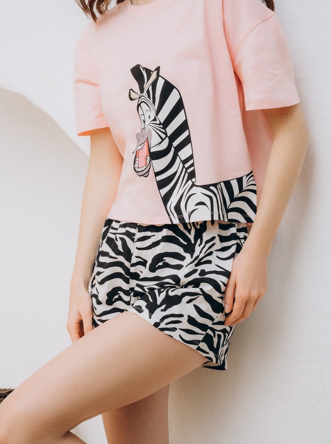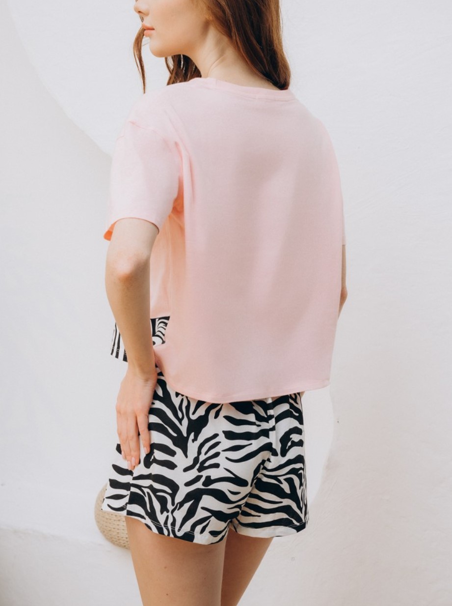 Пижама женская, изготовленная из хлопкового трикотажа, состоит из футболки и шорт. Футболка розового цвета имеет короткие рукава и округлый верхний вырез. Черно-белые шорты с тонкой эластичной резинкой на талии. Пижама украшена анималистичным принтом.