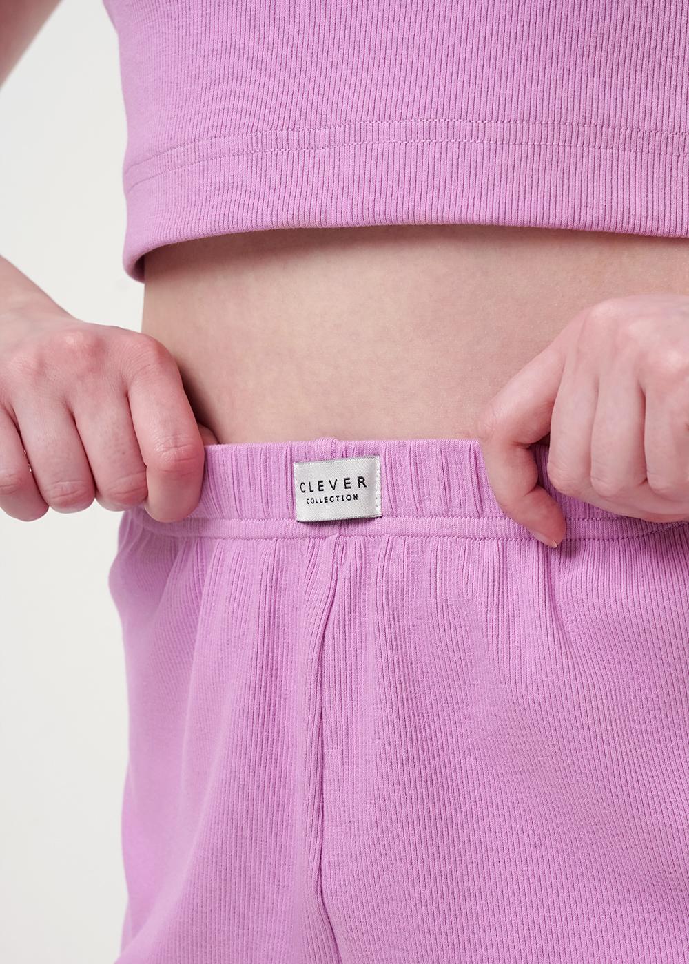Пижама для дома из трикотажного полотна кашкорсе лапша. Майка укороченная. Узкая бретель. Округлый вырез горловины. По горловине и пройме окантовка.Спереди нашивка. По низу внутренняя резинка. Шорты прямого кроя, пояс на внутренней резинке, нашивка.