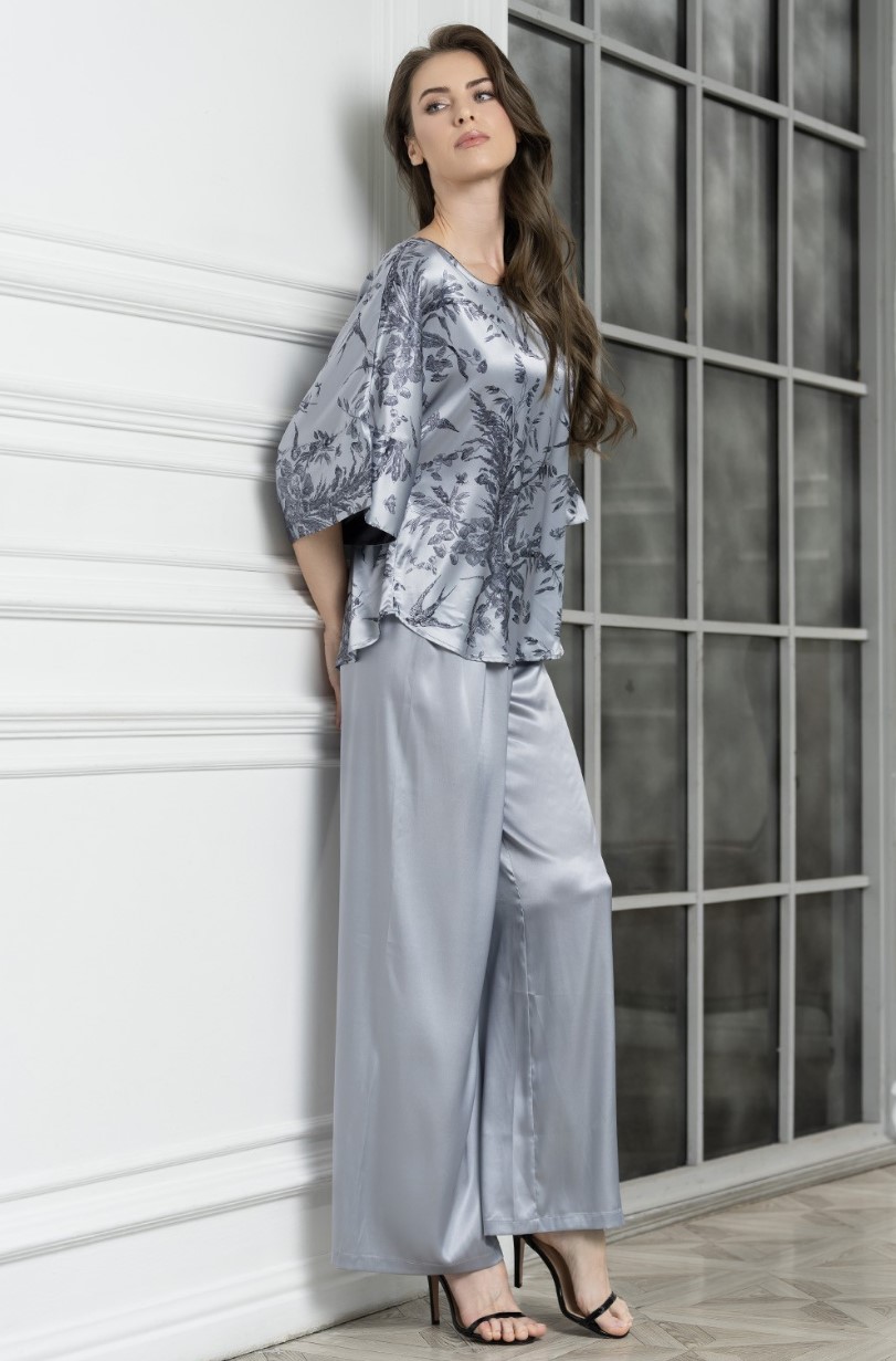 Комплект Mia-Amore состоит принтованного топа свободного силуэта и однотонных широких брюк-палаццо. Комплект выполнен из смесового шелка.