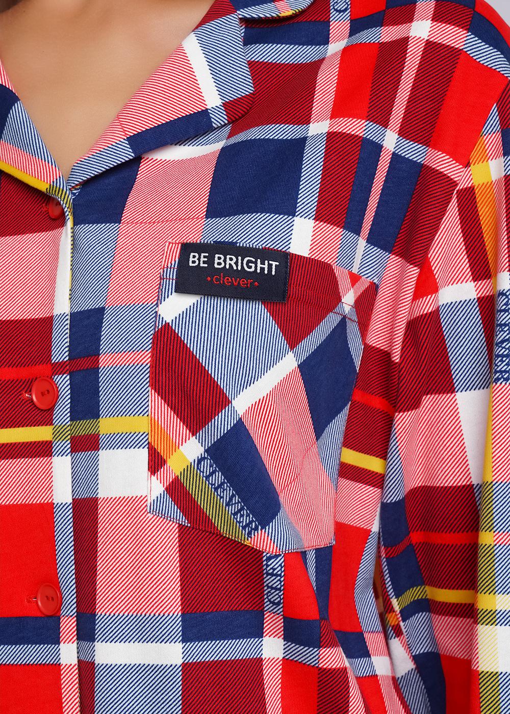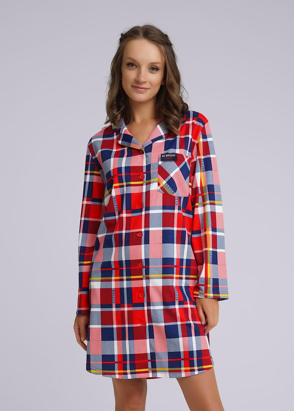 Платье-рубашка для дома из 100% хлопка с карбоном. Длинный рукав со спущенной линией плеча. Отложной воротник с лацканами. Застежка на пуговицы. В боковых швах карманы. На груди слева небольшой декоративный карман и жаккардовая нашивка.