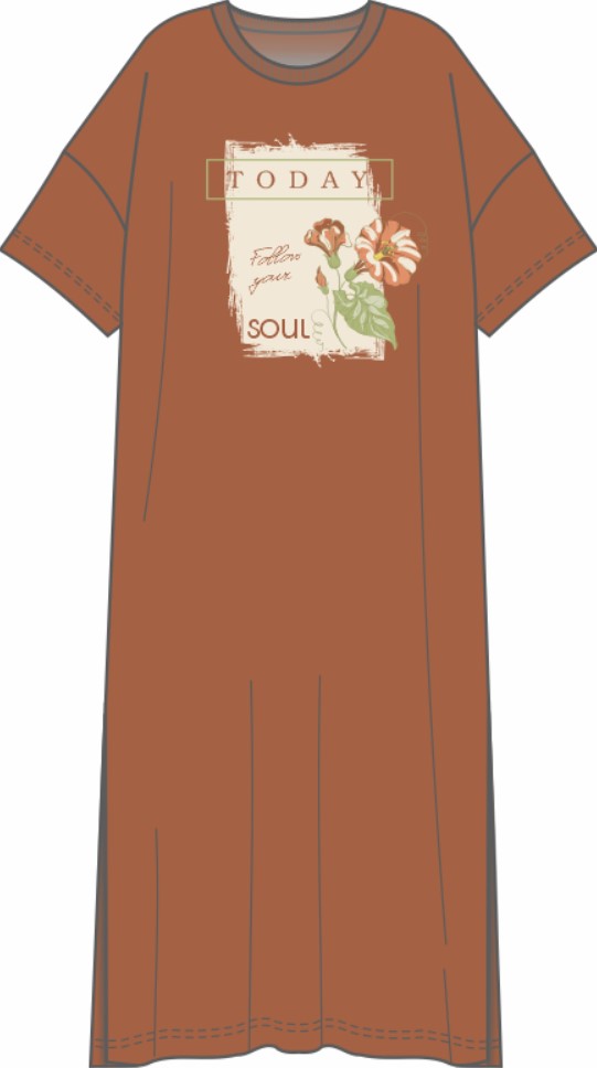 Платье – футболка, свободного прилегания классической длины. Линия низа декорирована разрезом.Вырез горловины круглый, линия плеча приспущена.Однотонное платье декорировано тематическим флористическим принтом.